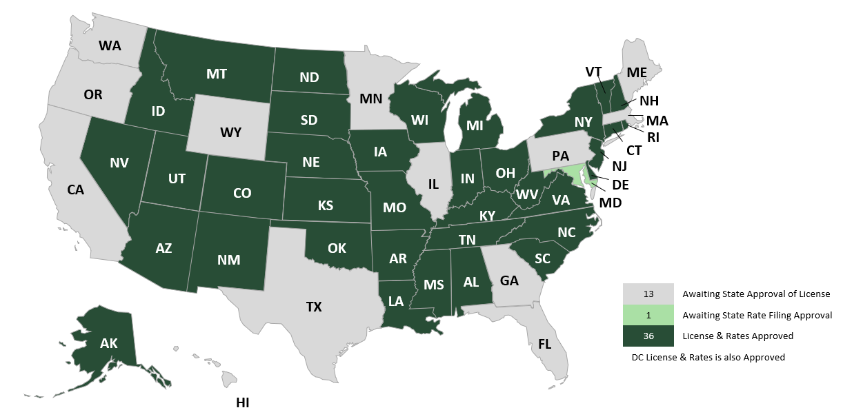 Since then, we have been working to have FFAC licensed (with approved rates) in all 50 states. FFAC has currently been approved in the following states: Alabama (AL), Alaska (AK), Arkansas (AR), Arizona (AZ), Colorado (CO), Connecticut (CT), Delaware (DE), Idaho (ID), Indiana (IN), Iowa (IA), Kansas (KS), Kentucky (KY), Louisiana (LA), Maryland (MD), Mississippi (MS), Missouri (MO), Montana (MT), Nebraska (NE), New Hampshire (NH), New Jersey (NJ), New Mexico (NM), New York (NY), North Carolina (NC), North Dakota (ND), Ohio (OH), Oklahoma (OK), Rhode Island (RI), South Carolina (SC), South Dakota (SD), Tennessee (TN), Utah (UT), Vermont (VT), West Virginia (WV), Wisconsin (WI).